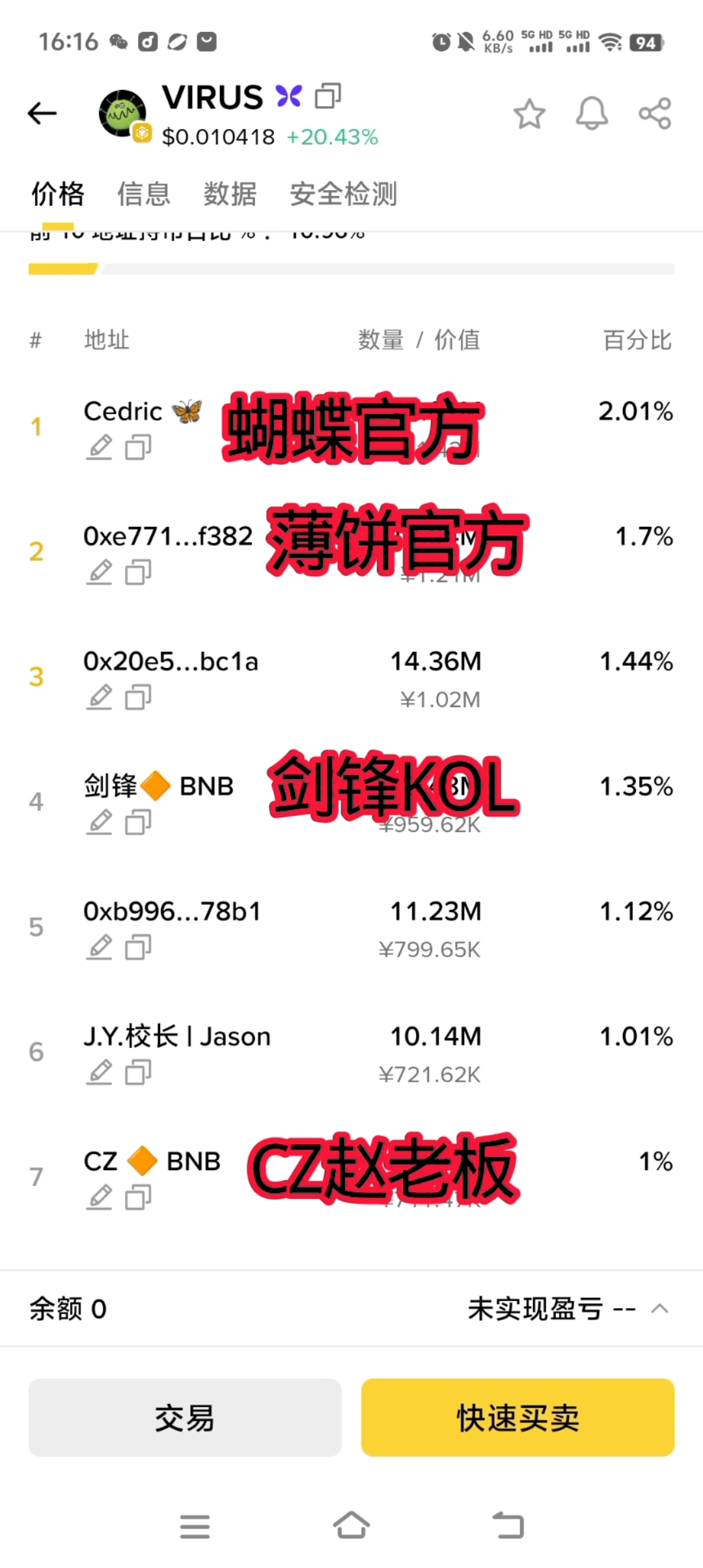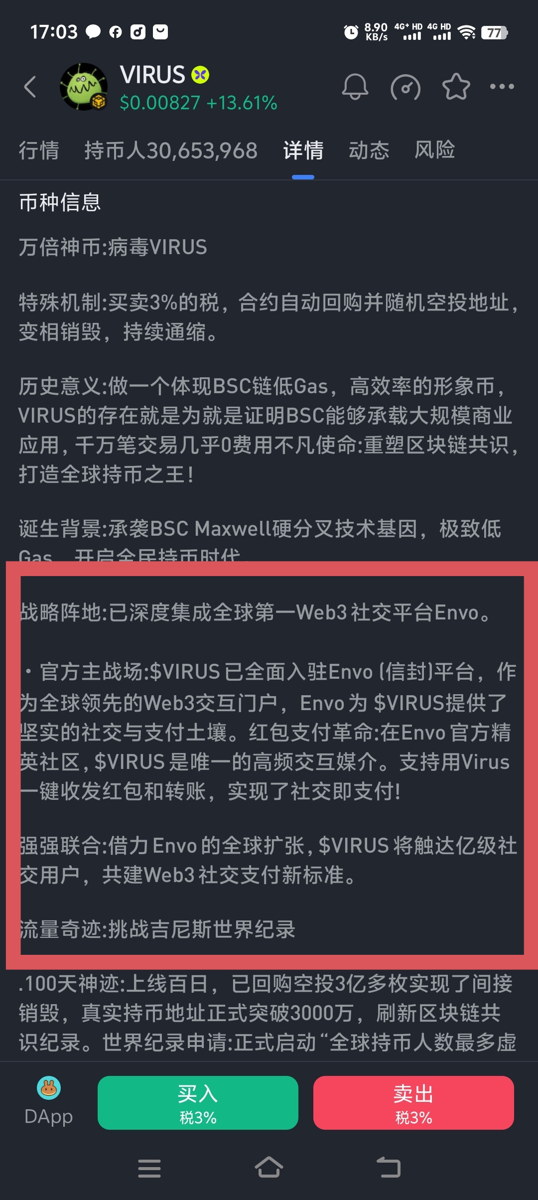 3千万人的持币地址,行业第一!!Virus与信封Evno达成战略合作;目标:(空投)每个钱包!!(只要是钱包,买入就可能得到空投,无限创建钱包,无限空投,叙事牛逼)。口号:让BSC再让次伟大(附合碧安利益)。天时地利人和都有,合约地址:0xa1ed61902f13e162305f59e1b2475e269e647777